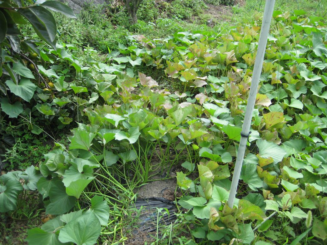 △こちらは小さい方の畑のサツマイモです。この畑は北側に石積みがあり、朝日は良く当たるのですが西日が避けられるので、夏の日照りも少しだけ緩和されたみたいです。その分ツルや葉の成長もしっかりしていて10月の芋ほりが楽しみです。