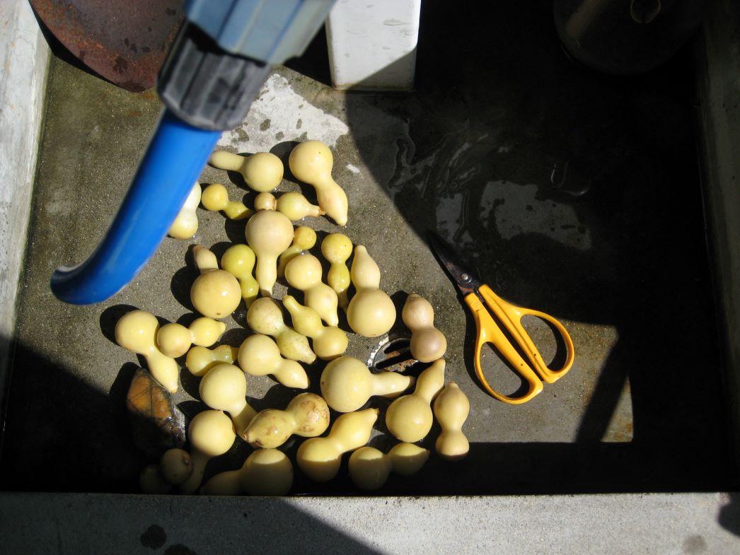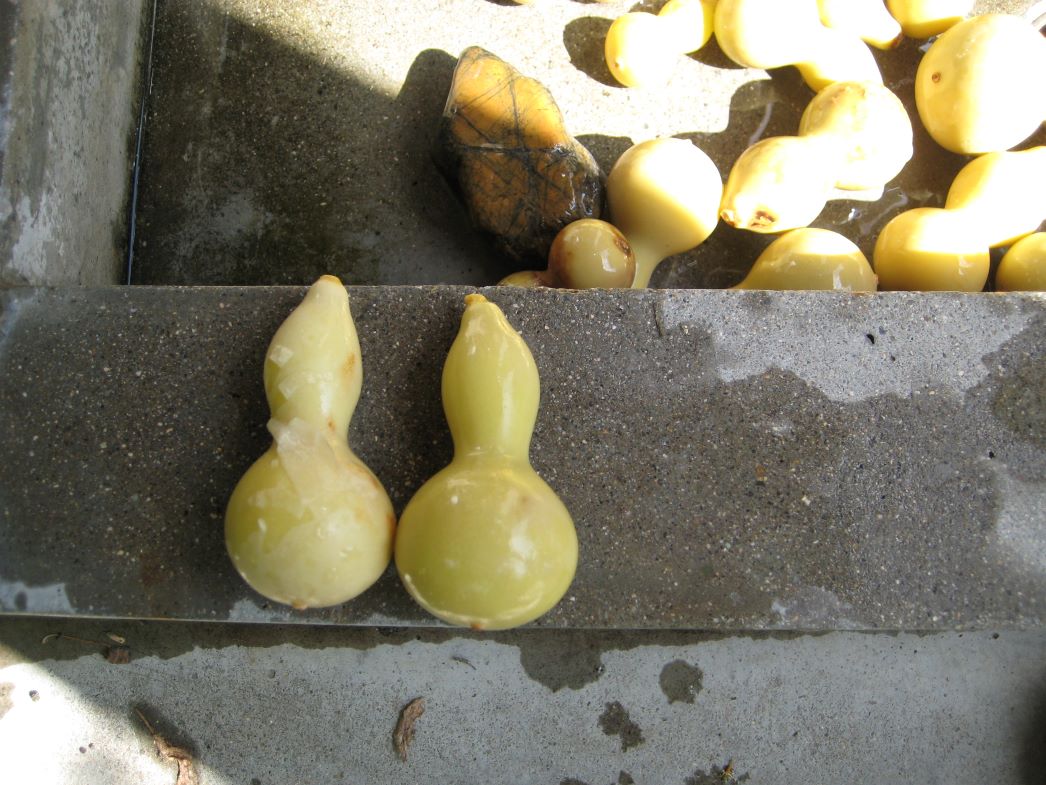 △水に漬けて2週間ほど経過した瓢箪の様子を見ながら、外の水道排水口で袋から出した様子です。表皮がうっすらと浮き上がっているぐらいが丁度よいタイミングです。漬けすぎると表皮が腐敗して匂いがきつくなるので、その直前がベストです。