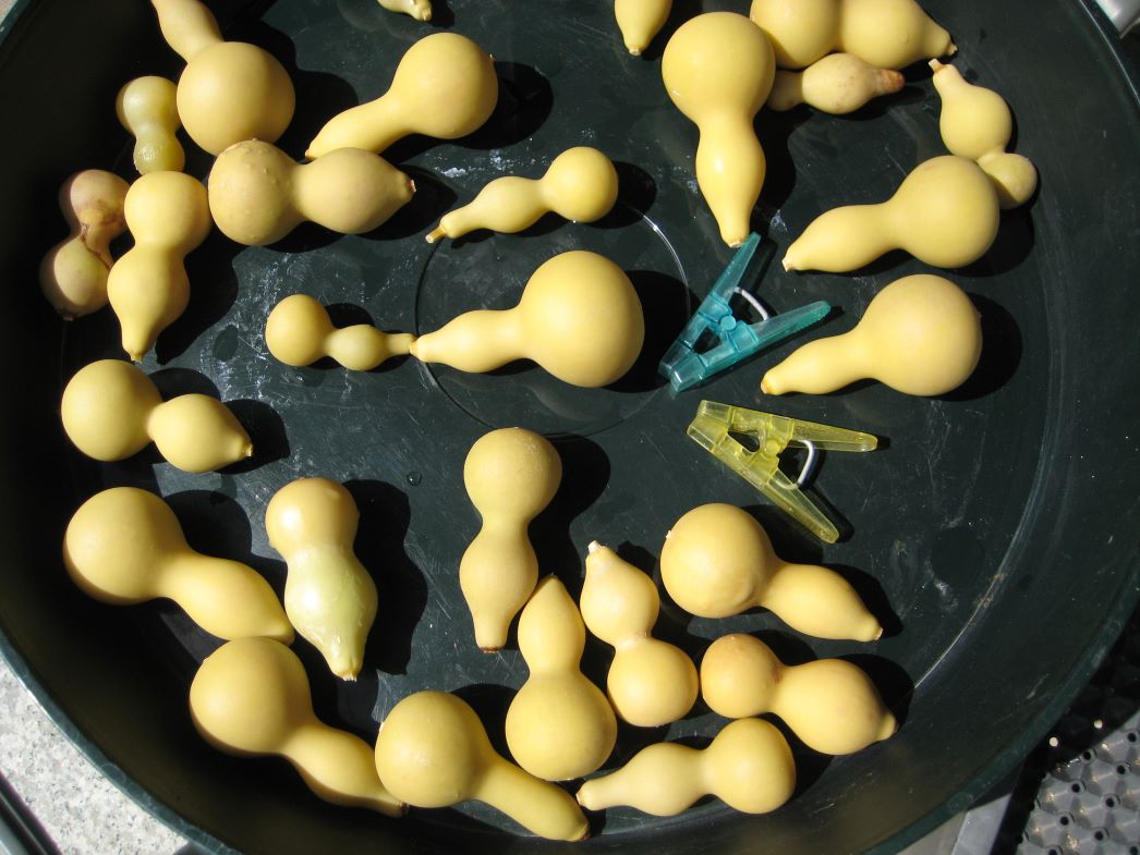 △これが薄皮を取り除いた状態の極小瓢箪です。洗濯バサミは瓢箪の大きさをイメージしてもらうために並べました。この状態で1~2週間風の通る所で干し上げれば、瓢箪素材の完成です。日陰で干せば白く、日に当てれば小麦色の瓢箪になります。