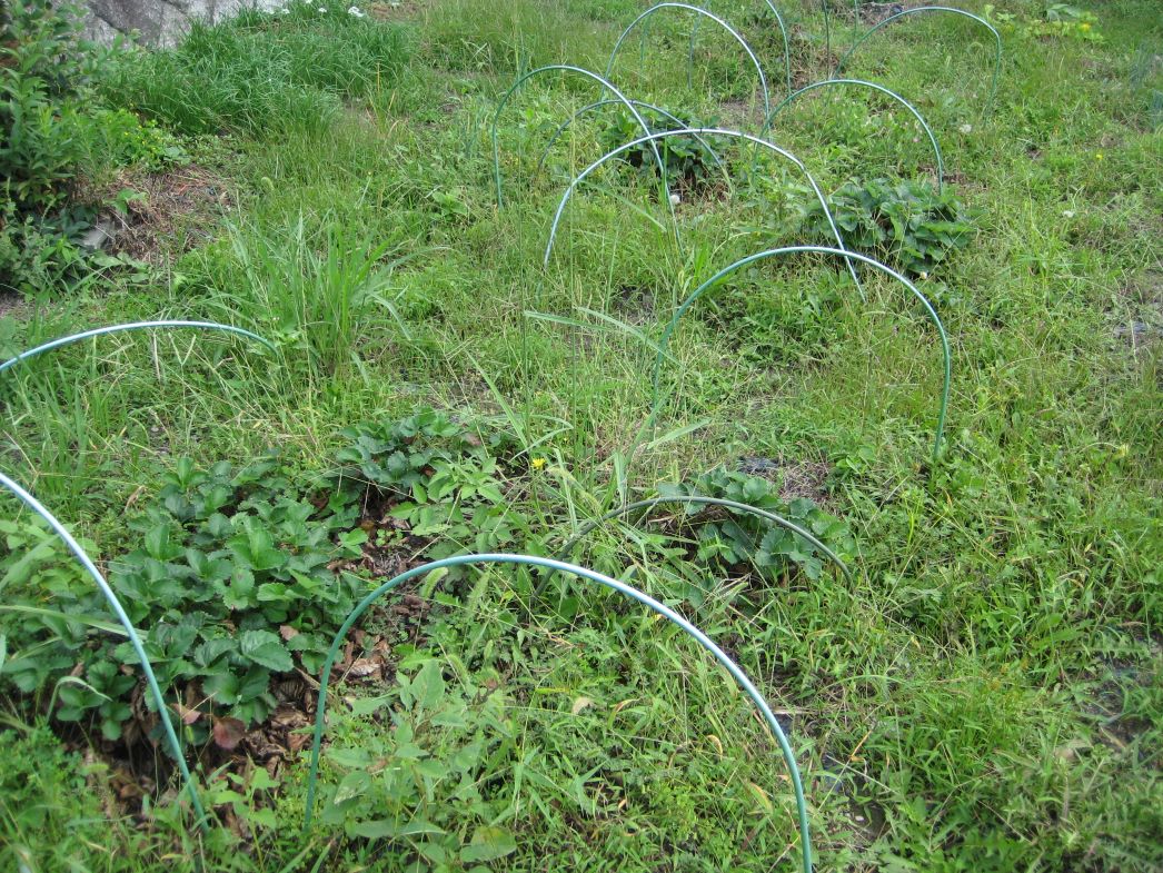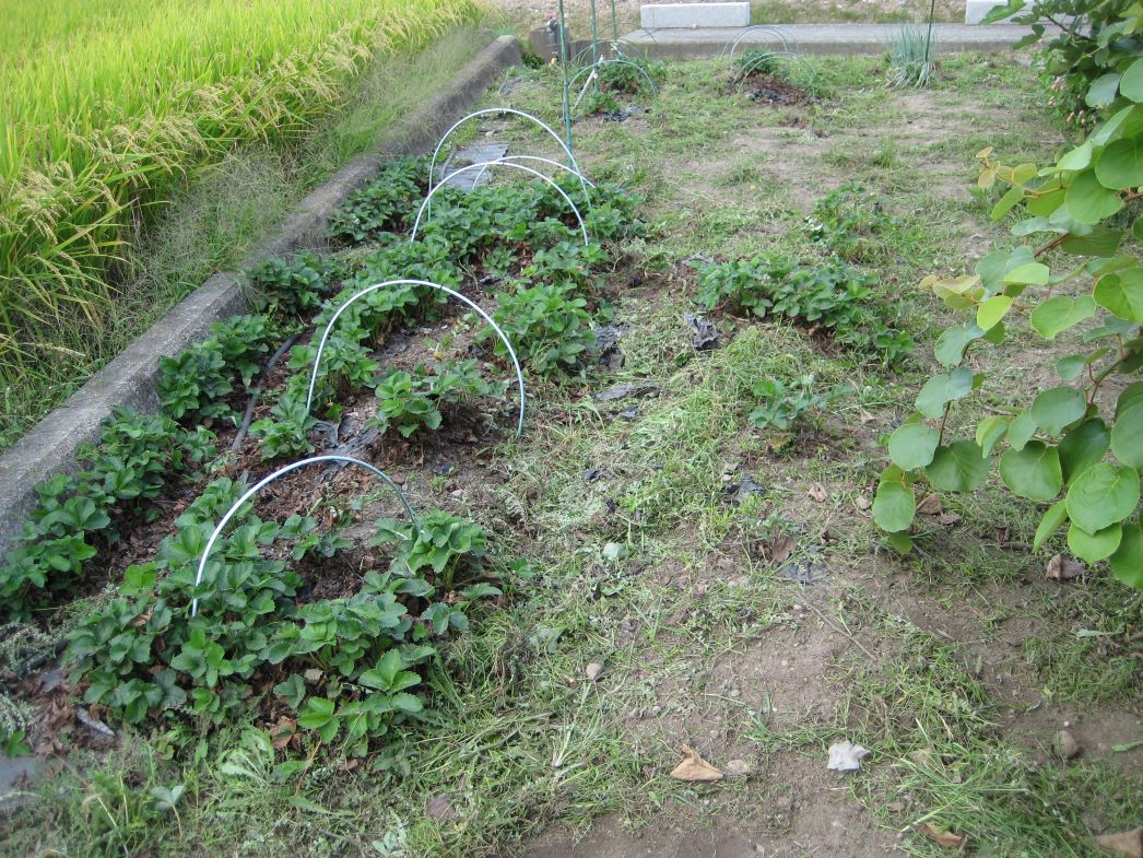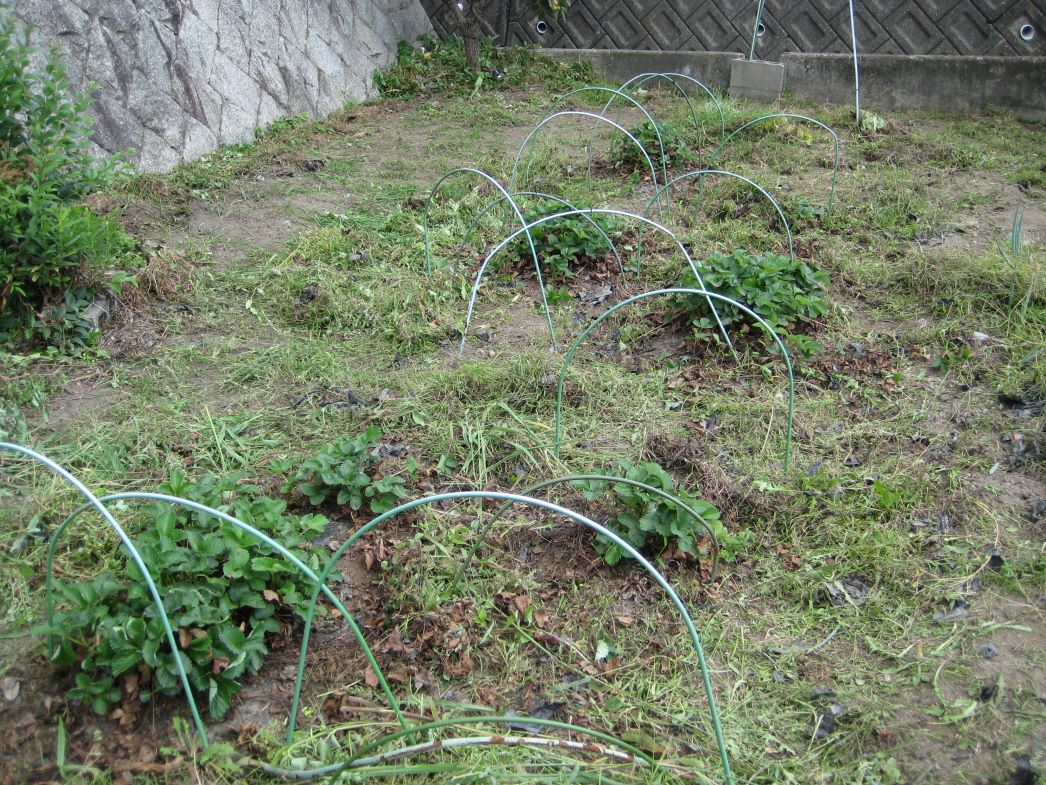 △同じ畑ですが別の畝です。ここも雑草を整理したら綺麗なイチゴ株が沢山出来ました。これらの株の上に、半円形の輪を設置し、冬を迎える前に不織布をかけてやれば冬越し支度の完了です。冬に休眠した株が春に目覚め、また沢山のイチゴを楽しませてくれます。