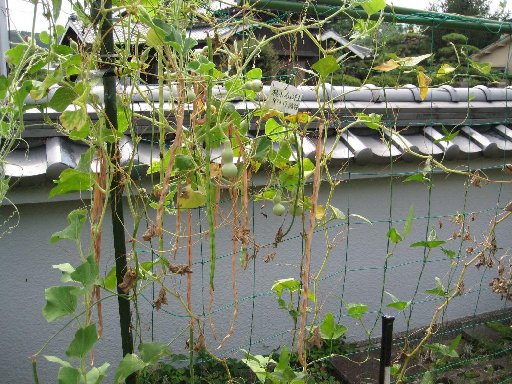 △写真の中で緑色と薄茶色の長く伸びたサヤが「三尺ささげ」です。この緑色の長いサヤはサヤごと煮物や炒め物でも美味しくいただけます。これをそのままツルに放置しておくと、薄茶色の乾いた長いサヤになります。一緒に写っている瓢箪はご愛敬でご覧ください。