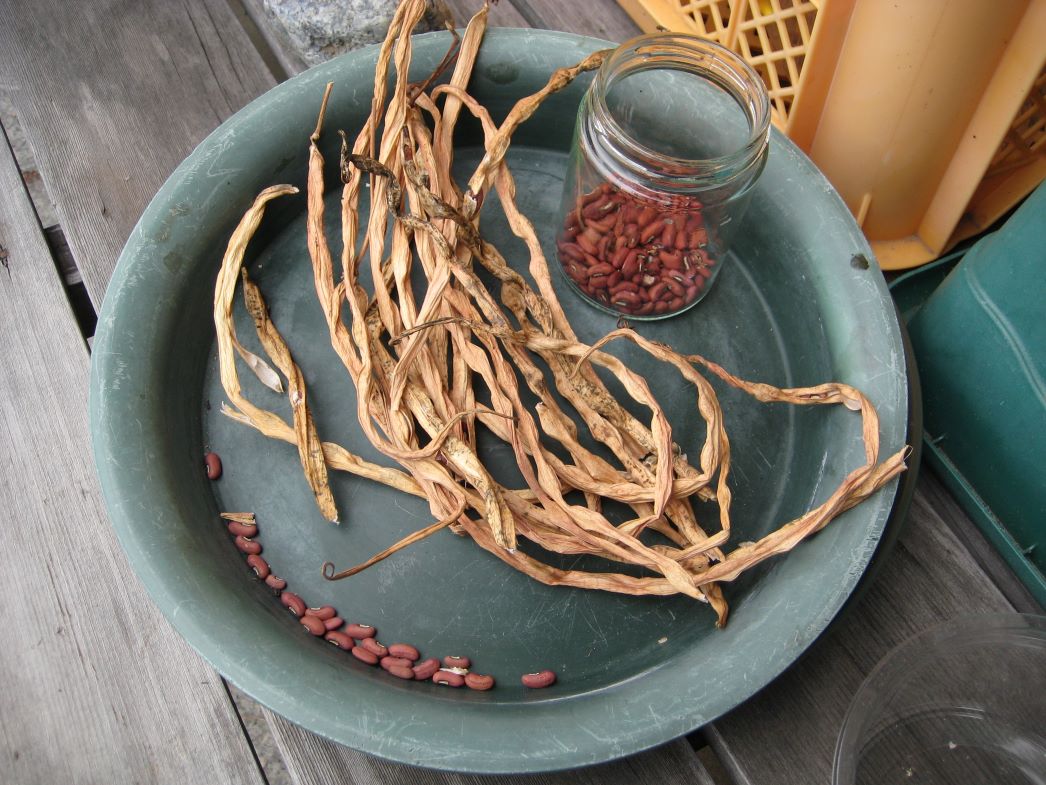 △これが庭のツルで完熟した三尺ササゲのサヤで、中には小豆に似た赤い豆が沢山入っています。サヤ自体は乾燥して薄い皮のようになっているので、簡単に中の豆を取り出すことが出来ます。
