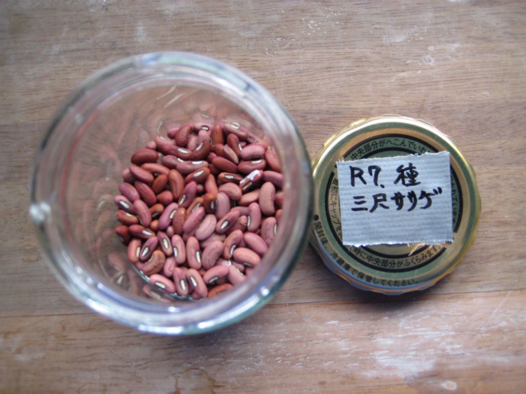 △このように空き瓶に乾燥剤をいれて豆を保存すれば完璧です。また来春これを播けば三尺ササゲが出来ます。ササゲは比較的簡単に育てられるので、少しの場所があれば栽培できます。花が咲いて、そこからササゲのサヤが長く伸びる姿は圧巻ですよ。