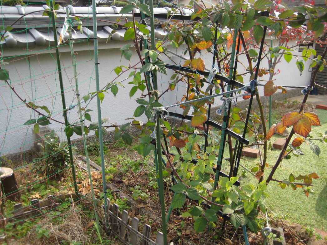 △これが長く伸びたツル枝をカットして冬越している様子です。ブラックベリーの幹自体はしっかり根づいているのですが、葉が枯れ落ち幹が寒風に晒される様子は毎年心配になります。でも幹自体は年を重ねるごとに太くなっているので、今年も大丈夫でしょう。