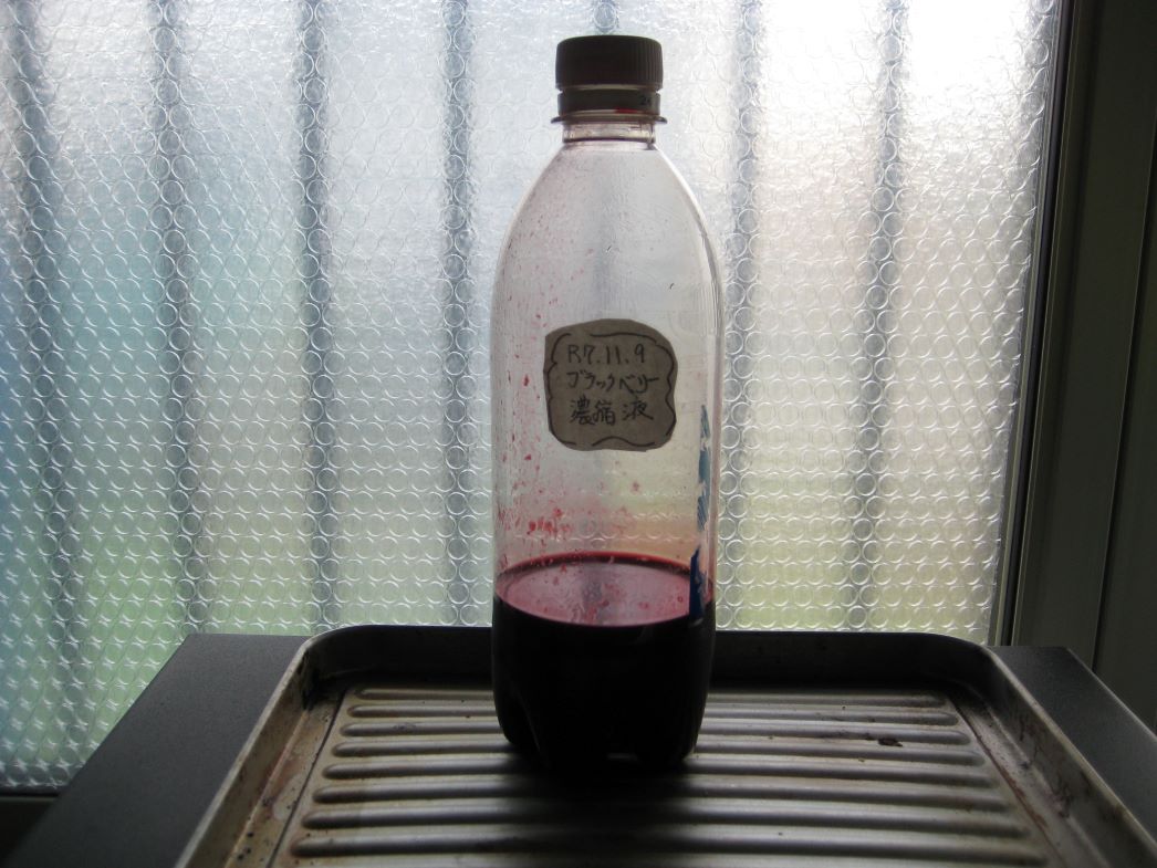 △ブラックベリーの実をすりつぶした凝縮液です。ザルの網目で種と皮を濾しとり、火入れはしますが沸騰はさせず、粗熱をとったら冷蔵庫で保存。これを炭酸水で割って、爽やかなジュースとして飲んでいます。いっぺんに作らず残った実は冷凍保存すれば、季節問わずにブラックベリージュースが飲めますよ。
