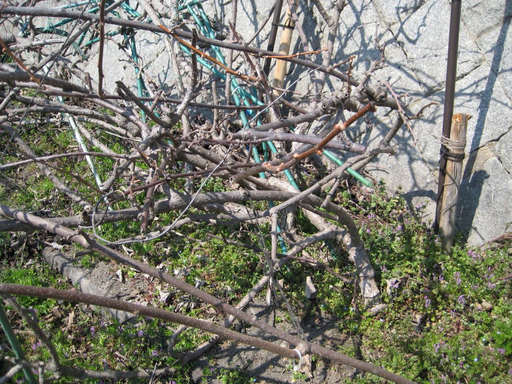 △10年ほど前に細い30㎝くらいの苗木で購入したアップルキウイ(雌木)です。写真の中央から少し右側に地面から力強く伸びだして見えるのが成長したアップルキウイです。もちろん近くに雄木も植えてあり、ともに寒さに耐えつつ春の訪れを待つ状態です。
