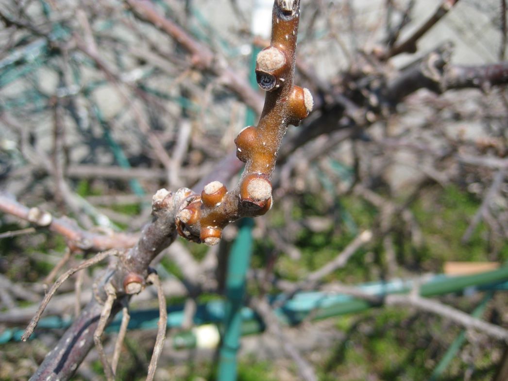 △これが春の訪れを待つアップルキウイの新芽です。春になるとこの新芽から一気に新たなツルがグングンと伸びて、そこに花芽が出来ていきます。本当にビックリするのですが、ツルも花芽もスゴイ勢いで伸びますよ。初夏にはその様子もレポートしますね。