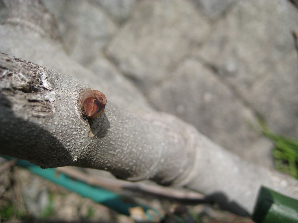 △こちらはイチジクの木です。これもキウイと同じで10年ほど前に30㎝くらいの苗木で購入し畑の隅に植え付けたものです。昨年の収穫が終わった後に、枝をかなり刈り込み整理したものです。春を待つように太い幹に新芽が現れ始めました。この新芽も毎年ビックリするほど大きな枝に成長します。
